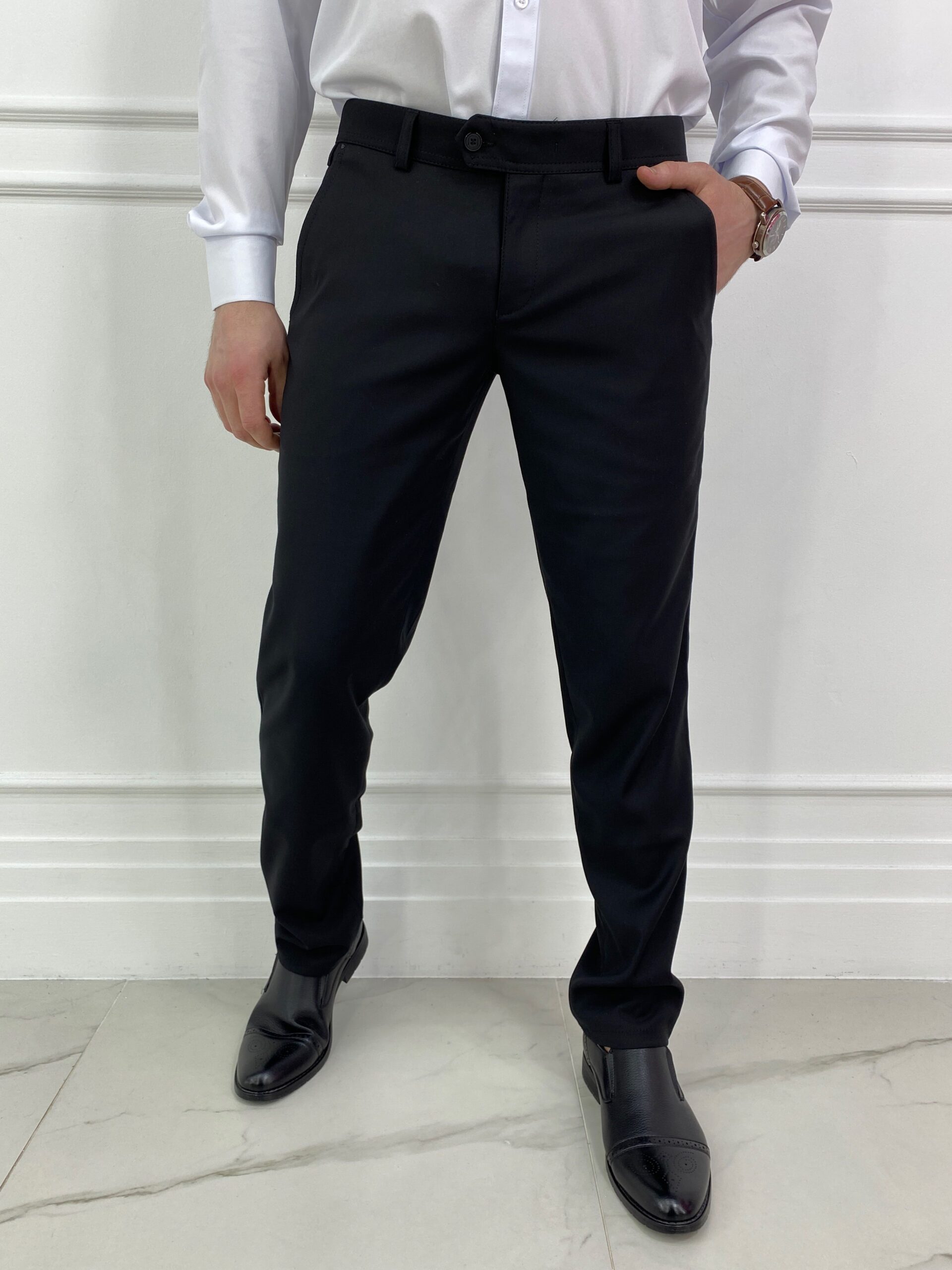 Брюки с застёжкой на молнию и пуговицу, без карманов-пейзажей и аккуратными швами выглядят сдержанно и элегантно. Если вы предпочитаете более неформальный стиль — выбирайте модели с резинкой на поясе и лёгкой текстурой, например, из хлопка с эластаном.