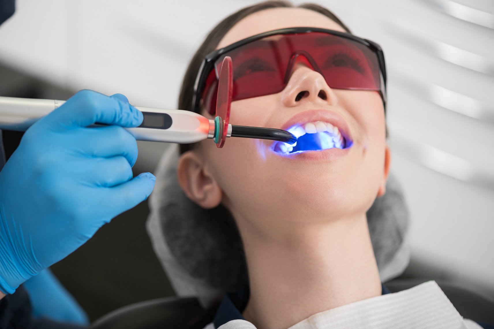 — Процесс: Стоматолог использует отбеливающий гель, содержащий пероксиды, нанося его на зубы. В некоторых случаях может применяться световая активизация геля.