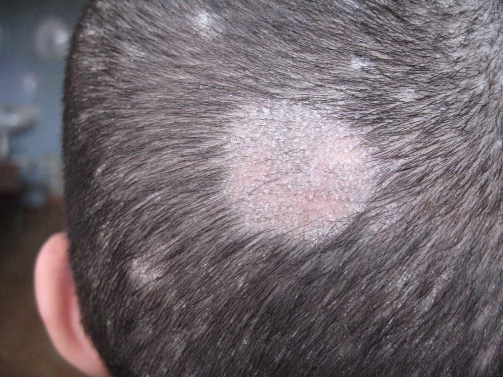— Симптомы: Появление красных пятен, покрытых серебристыми чешуйками, чаще всего на локтях, коленях и на scalp.