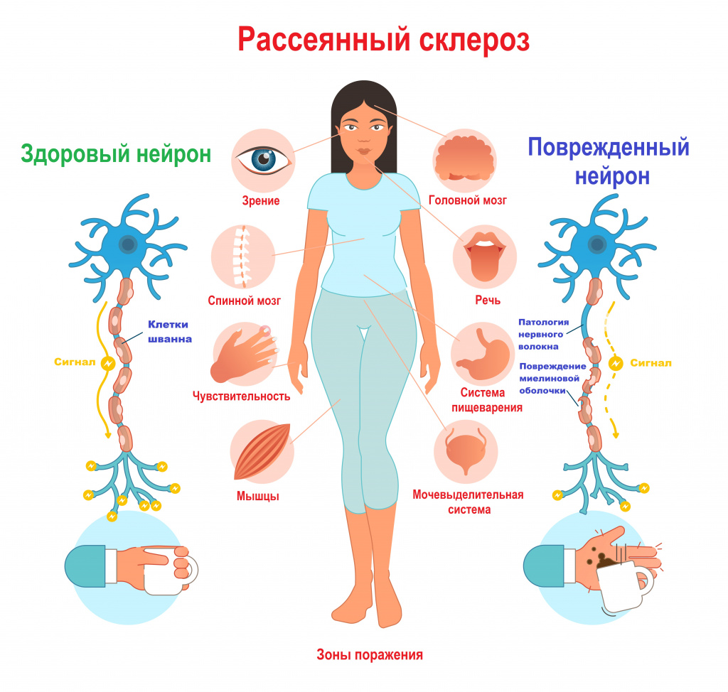 Рассеянный склероз (РС) — это аутоиммунное заболевание, поражающее миелиновую оболочку нервных волокон. Симптомы могут варьироваться, но обычно включают: